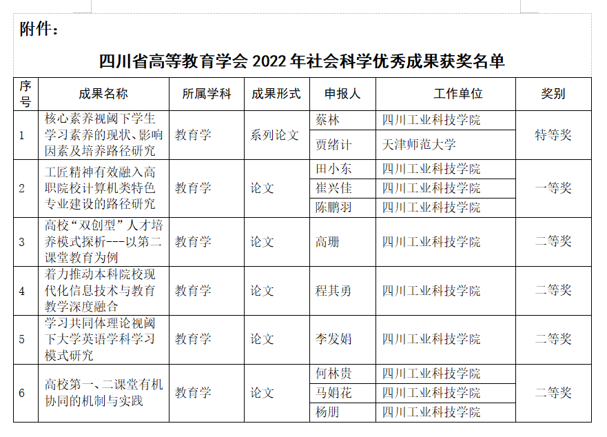 根据四川省高等教育学会《关于开展四川省高等教育学会社会科学优秀成果遴选暨四川省第二十次社会科学优秀成果评奖初评工作的通知》,学校马克思主义学院积极组织教师参加本次优秀成果评选,荣获2022年四川省高等教育学会社会科学优秀成果奖特等奖1项,一等奖1项,二等奖4项。