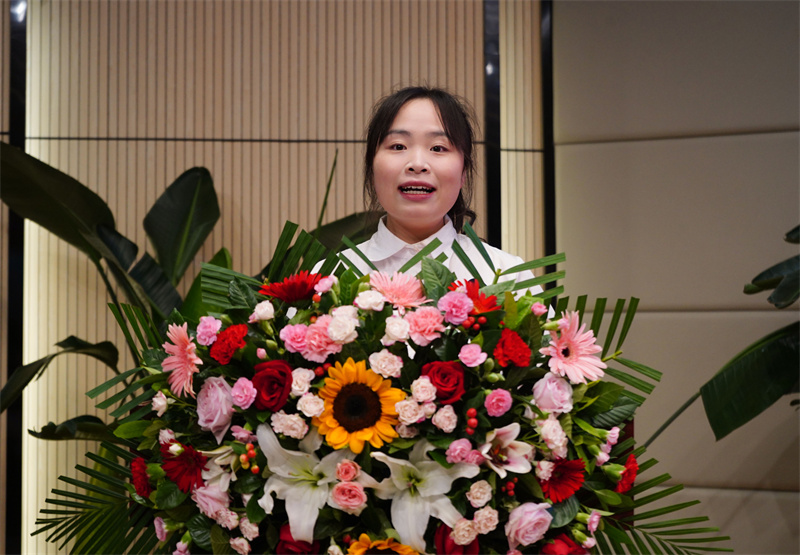 蹇欣洲作为优秀辅导员代表表达了对教育事业的热爱和乐于奉献、求真务实的信心和决心。