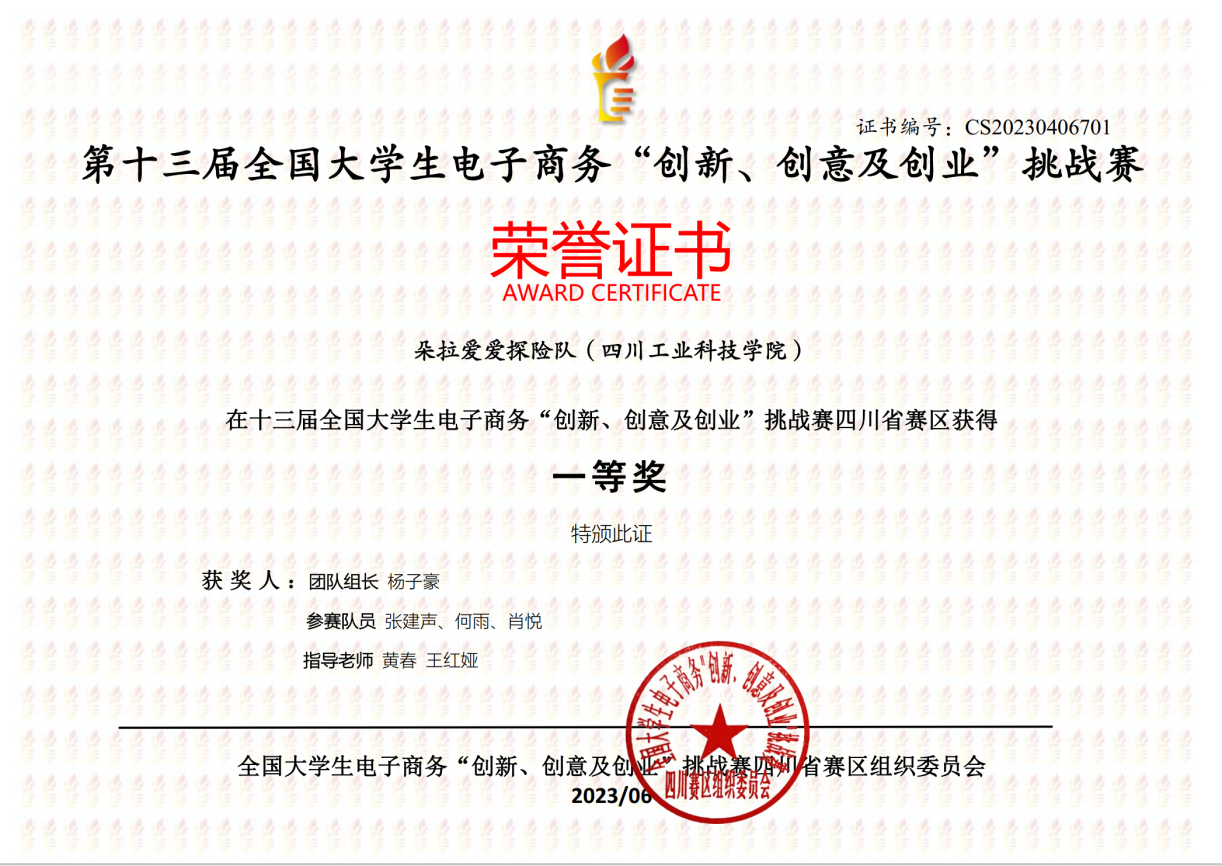 近日,电子信息与计算机工程学院学生杨子豪等四名同学在第十三届全国大学生电子商务“创新、创意及创业”挑战赛四川省决赛中夺得一等奖。