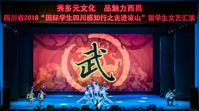25日晚,我校国际学生受邀参演四川省首届国际留学生文化节文艺晚会,该晚会是四川省2018“国际学生四川感知行之走进凉山”系列活动之一,有全省10所高校不同风格的优秀作品在晚会中展出。我校参演作品为民乐歌武—《乐品四大名著》,本节目将经典的四大名著乐曲—《卧龙吟》、《葬花吟》、《天宫迅音》和《好汉歌》进行改编,以上音乐融合中国古典舞、太极扇、琵琶与中阮合奏、刀术、剑舞等表现形式,整个节目形式新颖、内涵丰富,体现了留学生对中华传统文化的深入思考与理解。