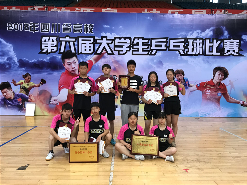 5月25日,学校参加“2018年四川省高校第六届大学生乒乓球比赛”取得了男子双打冠军、混合双打冠军、男子团体二等奖、女子团体二等奖、女子双打第四名及男子单打第七名的好成绩。