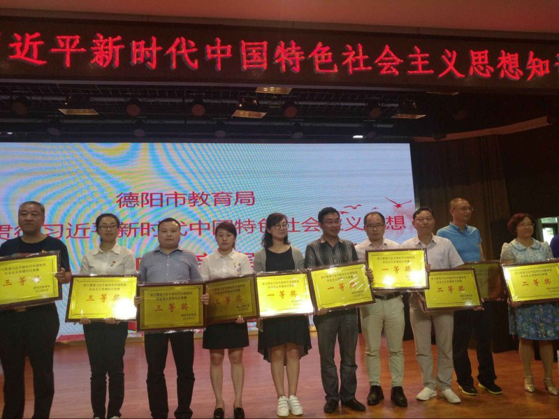 5月30日,由德阳市委教育工委举办的学习贯彻习近平新时代中国特色社会主义思想知识竞赛在庐山路小学礼堂举行。我校受邀参加大、中学组的比赛。参赛队员发挥稳定并以总分180分的成绩稳居榜首,夺得本次知识竞赛的第一名。