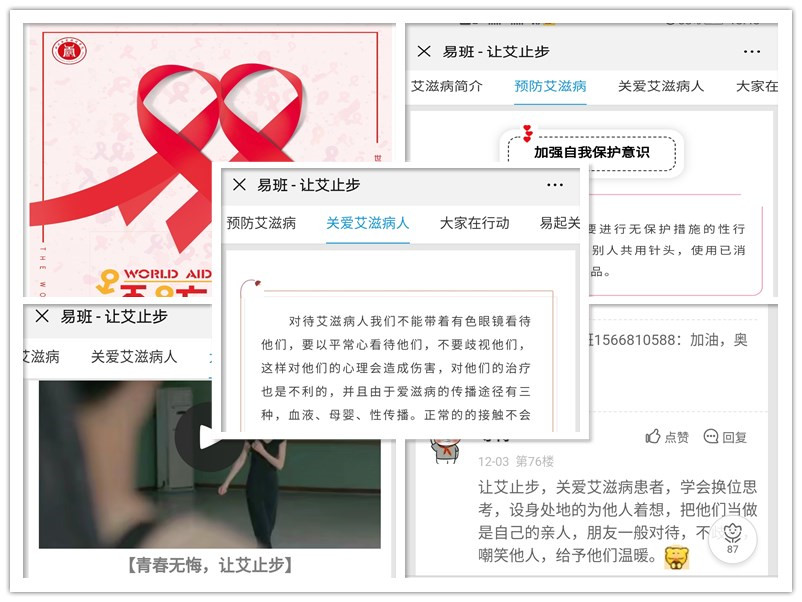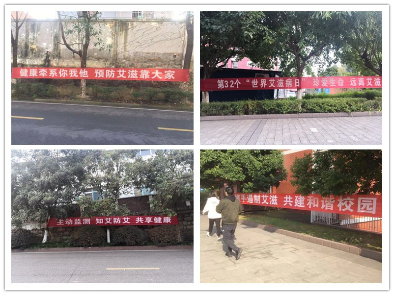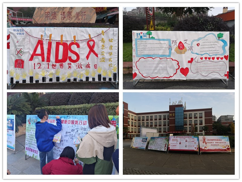 校园内多处悬挂起鲜艳的横幅,摆放着形式多样的健康知识宣传教育展板,不时有师生停下脚步细读。罗江区社区卫生服务中心、罗江区疾病预防控制中心工作人员建立健康咨询点,还与志愿者们一同为师生发放防艾宣传手册、宣传图片、抗击艾滋学生读本等健康教育宣传资料,让更多的师生了解艾滋病,关注艾滋病防治。易班学生发展中心借助易班平台搭建防艾微网页,设置“艾滋病简介,预防艾滋病,关爱艾滋病人,大家在行动,易起关爱”五个栏目宣传普及防治艾滋病相关知识。各二级学院踊跃参与防艾活动,师生们纷纷将红丝带贴在胸前,并在AIDS宣言旁庄重地签上自己的名字。我校爱心天使协会、电信学院和食品学院宣传部也通过形式多样的手绘展板将防艾知识深入师生学习和生活中,帮助师生们进一步了解艾滋病防治。