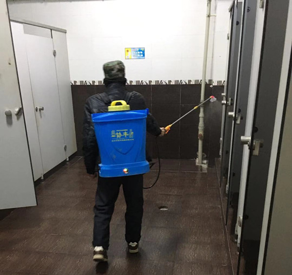 工作人员在对卫生间进行消毒