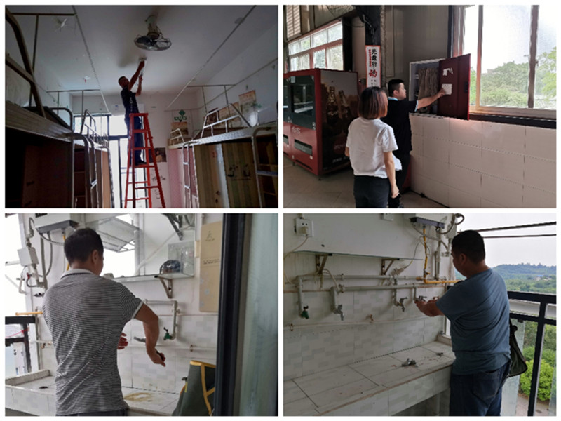 学生返校复课前,后勤管理处维修工人合理分点分区,对学生公寓、教学楼、体育馆等校内各区域全面检修维护。分别对学校路灯照明、教学楼风扇、喷泉等各处线路检修更换,并对教室桌椅、门锁进行了全覆盖地毯式维修更换。在学校开展2020年春季开学复课前安全大检查的契机下,后勤管理处反复核查,完善整改,确保学生宿舍、教学楼、实训室、食堂等处安全“零”隐患。