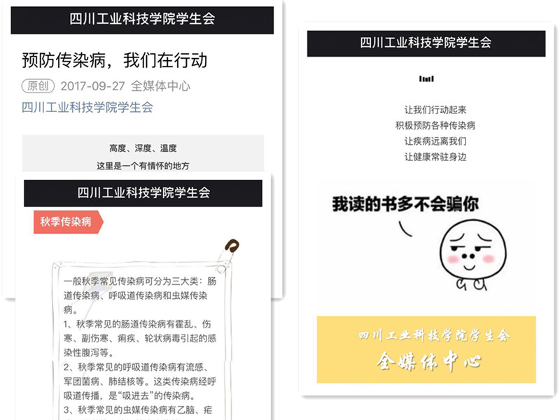 风是秋后爽,雨是秋后凉,进入秋季,天气转凉,昼夜温差较大,正是一些传染病高发时节。学校是易感人群的密集场所,为了有效控制传染病在我校流行,我校后勤管理处开展了秋季传染病防控的知识宣传工作。通过在师生人流量大的责任广场竖展板、在体育场、学生公寓和教学楼拉横幅等方式进行宣传,同时利用学生会全媒体中心公众号新媒体进行了受众广泛的宣传,在大家共同的努力下,为有效防病打下了良好基础。