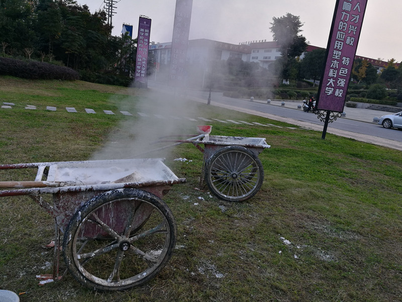 环卫绿化工人在科学调配氢氧化钙合剂混合物