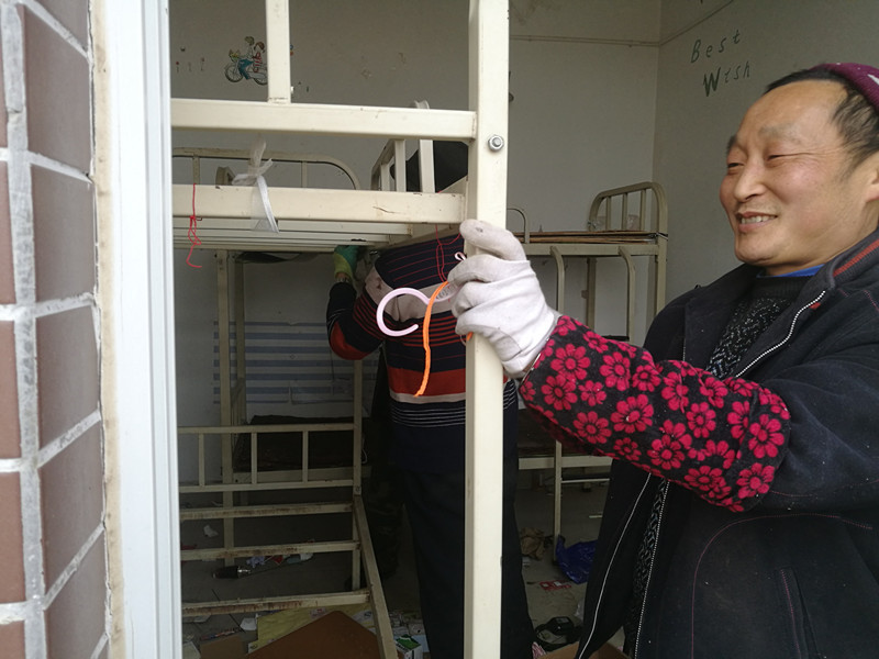 后勤工作人员在拆床为学生公寓改造做准备工作