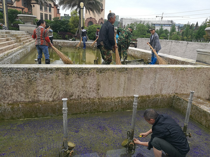 环卫绿化科全体工作人员全体人员主动放弃中午休息时间,不怕苦、不怕累,对喷泉池进行了全面彻底的清洗和维护,保质保量地按时完成了任务。他们首先将池中水排放干净,工作人员穿着雨鞋进入池子,用双手捡拾池中石子等颗粒物,用铲子清理淤泥等杂物,用扫帚、拖把清除池底和池壁上的青苔,并用高压水枪对池壁、池底进行了全面冲洗,最后用清水冲洗水池,经过半天的努力,终于对喷泉池进行了一次彻底的大清洗。