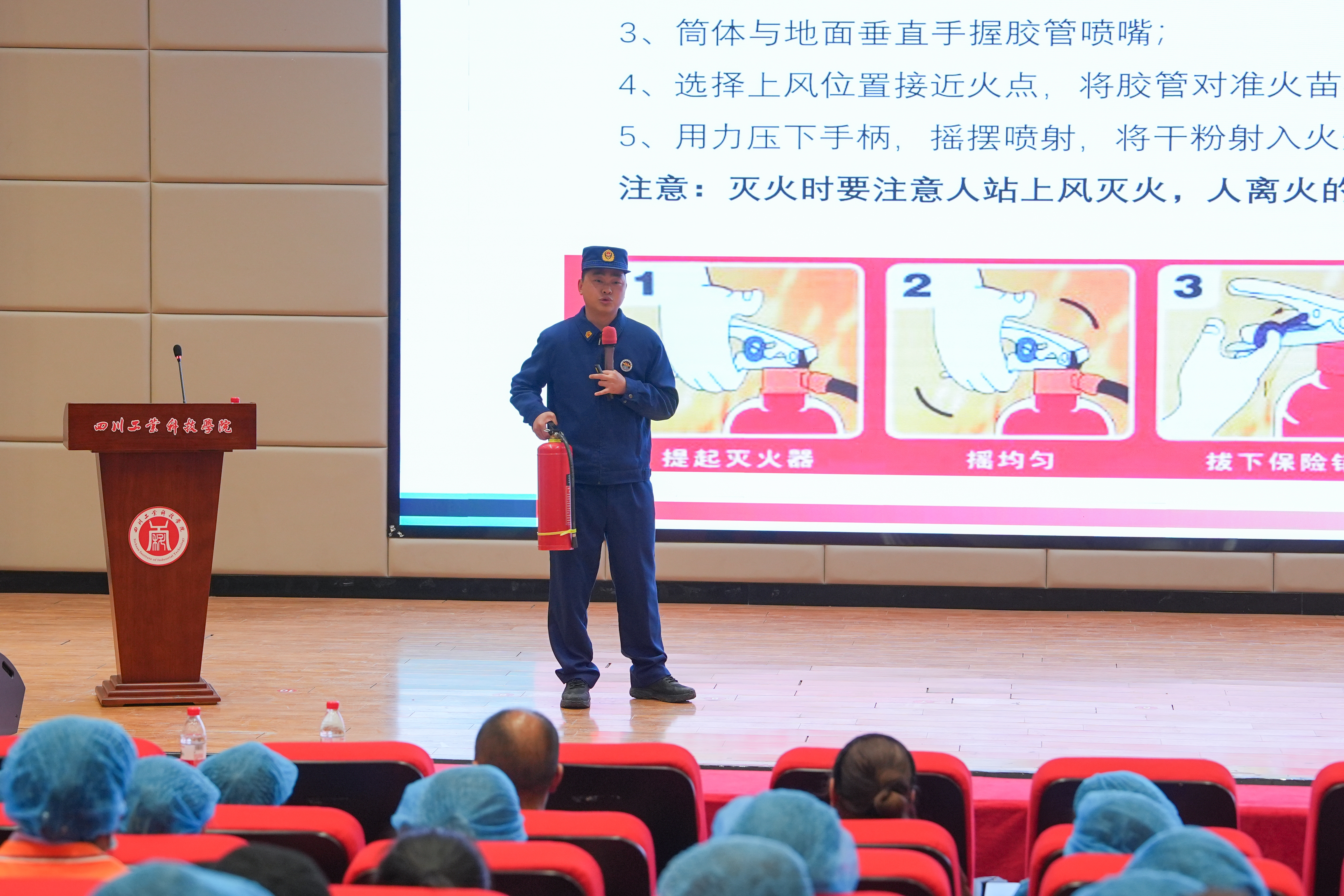 接着,罗江区消防救援大队培训教官舒龙为参会人员开展灭火器使用专项培训。他结合食堂、商铺工作实际,细致讲解灭火器的分类、正确使用方法及注意事项,并现场演示“提、拔、握、压”等规范操作流程,切实增强食品从业人员的消防安全意识与应对突发事件的能力。