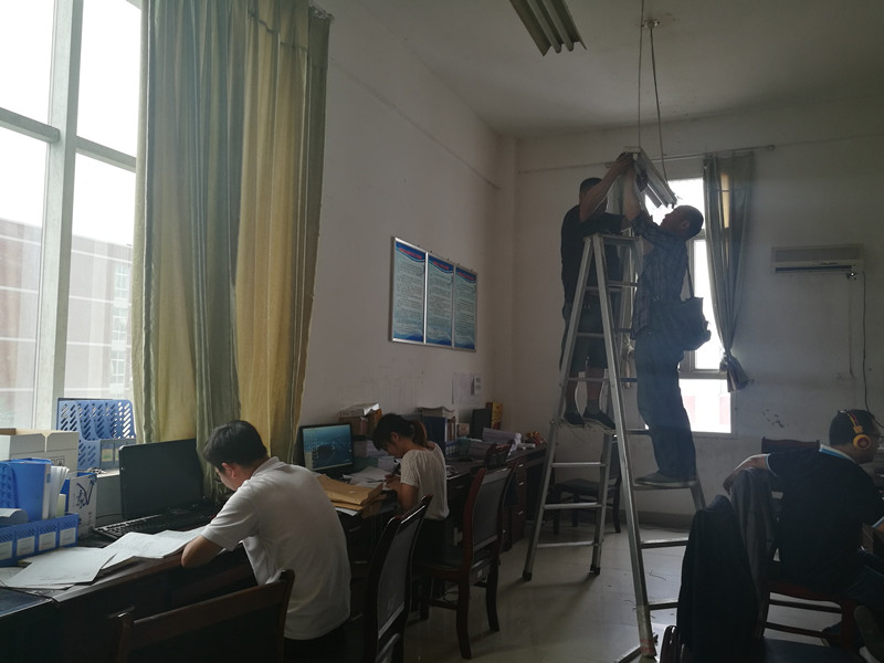 水电工正在教师办公室更换灯管