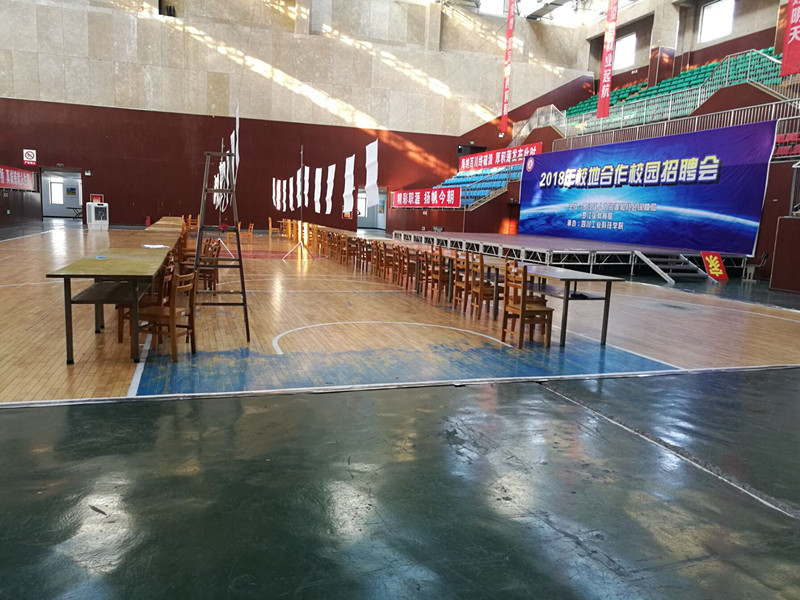 为了确保2018年校地合作专场双选会顺利举行,后勤管理处提前进行了周密部署,制定了详细的工作方案,明确工作任务及流程,认真落实主会场环境布置,主席台布置工作,确保双选会期间各会场环境优美整洁、方便、舒适。整个后勤保障工作中,共铺设主席台100平方、搬运桌子40余张、椅(凳)子100余把,不间断提供保温开水服务、水电保障和清洁卫生等工作。我处圆满完成了学校招聘会的服务保障工作,确保了2018年校地合作专场双选会有序、平稳、安全开展。