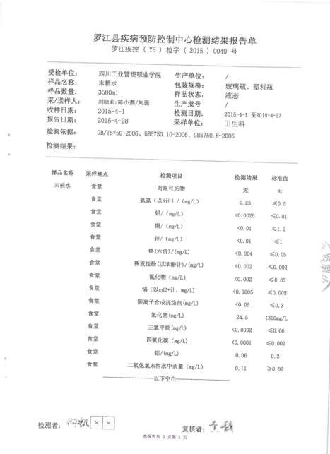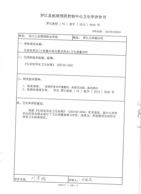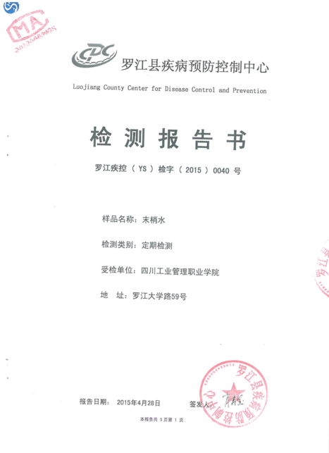 学校饮用水质量的高低直接影响着师生的身体健康,影响着师生的工作和学习,近年来,学校非常重视师生饮用水工作,不惜投资,对学校饮用水设施进行改造,经常性对饮用水设备进行维护修理,坚持定期对饮用水源进行检测化验,确保水源水质卫生安全可靠。以下是2015年4月28日由罗江县疾病预防控制中心对我校饮用水进行的一组检测报告,学院师生能够放心使用。
