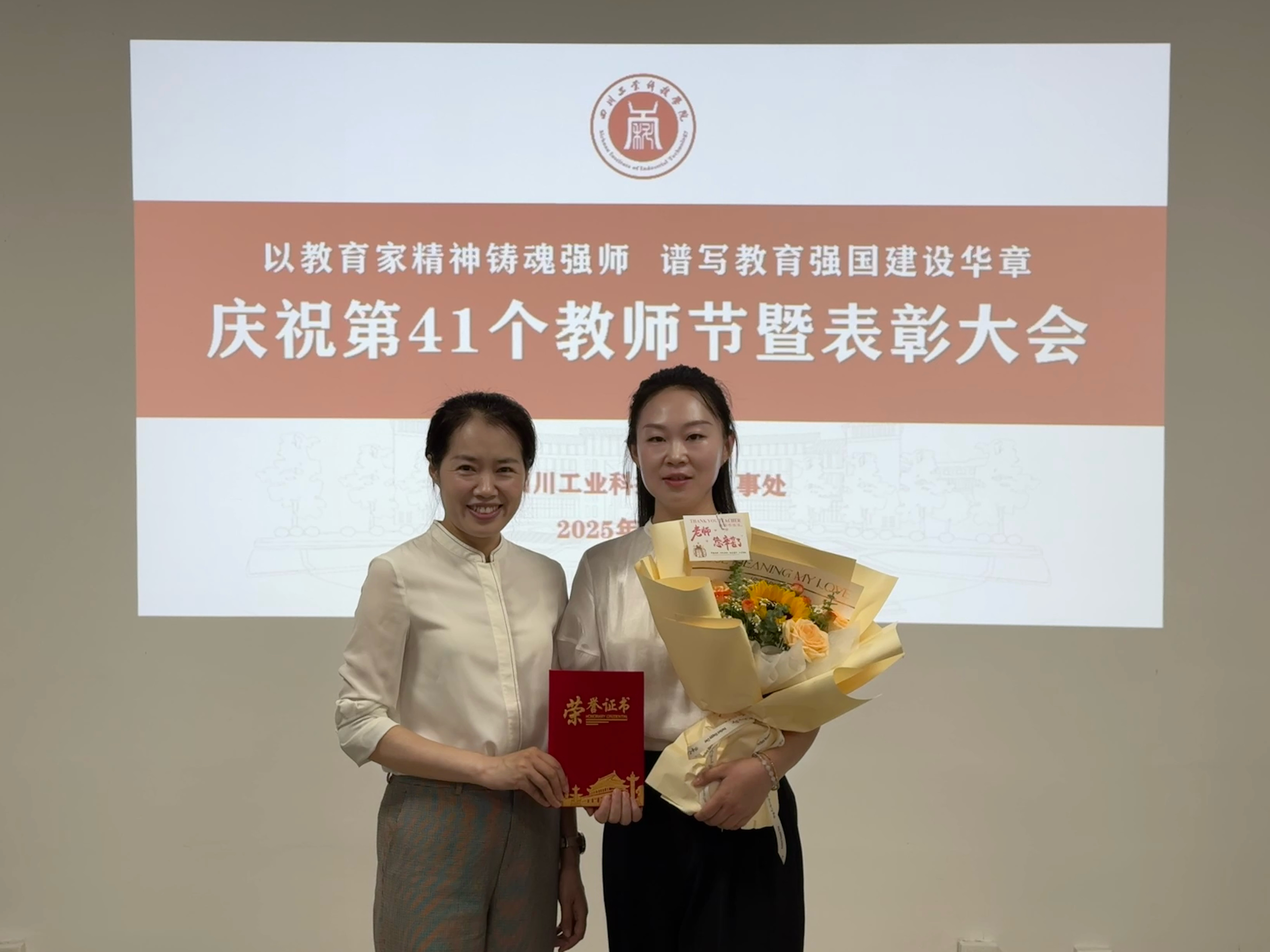 老师以及荣获学校“优秀教育工作者”称号的徐莹老师颁发荣誉证书。部门同事代表向两位受表彰老师献花,现场响起热烈掌声。