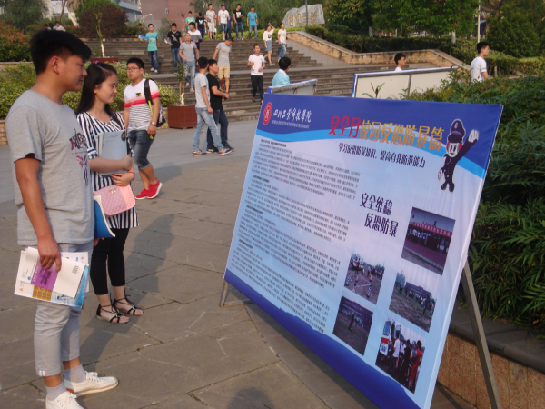 活动期间,罗江校区通过校园广播站、学院网站、LED电子显示屏、张贴宣传画报、悬挂安全警示横幅、展放宣传展板等形式,广泛宣传消防、防灾减灾、安全用电、交通、饮食卫生、禁毒、心理健康、治安等专题案例及安全知识展板。
