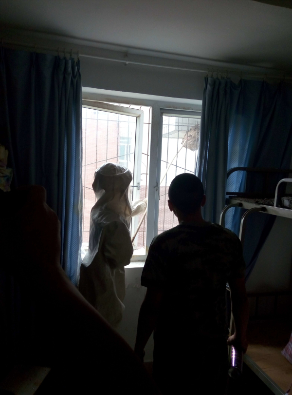 消防人员对学生公寓窗户外的马窝蜂进行摘除