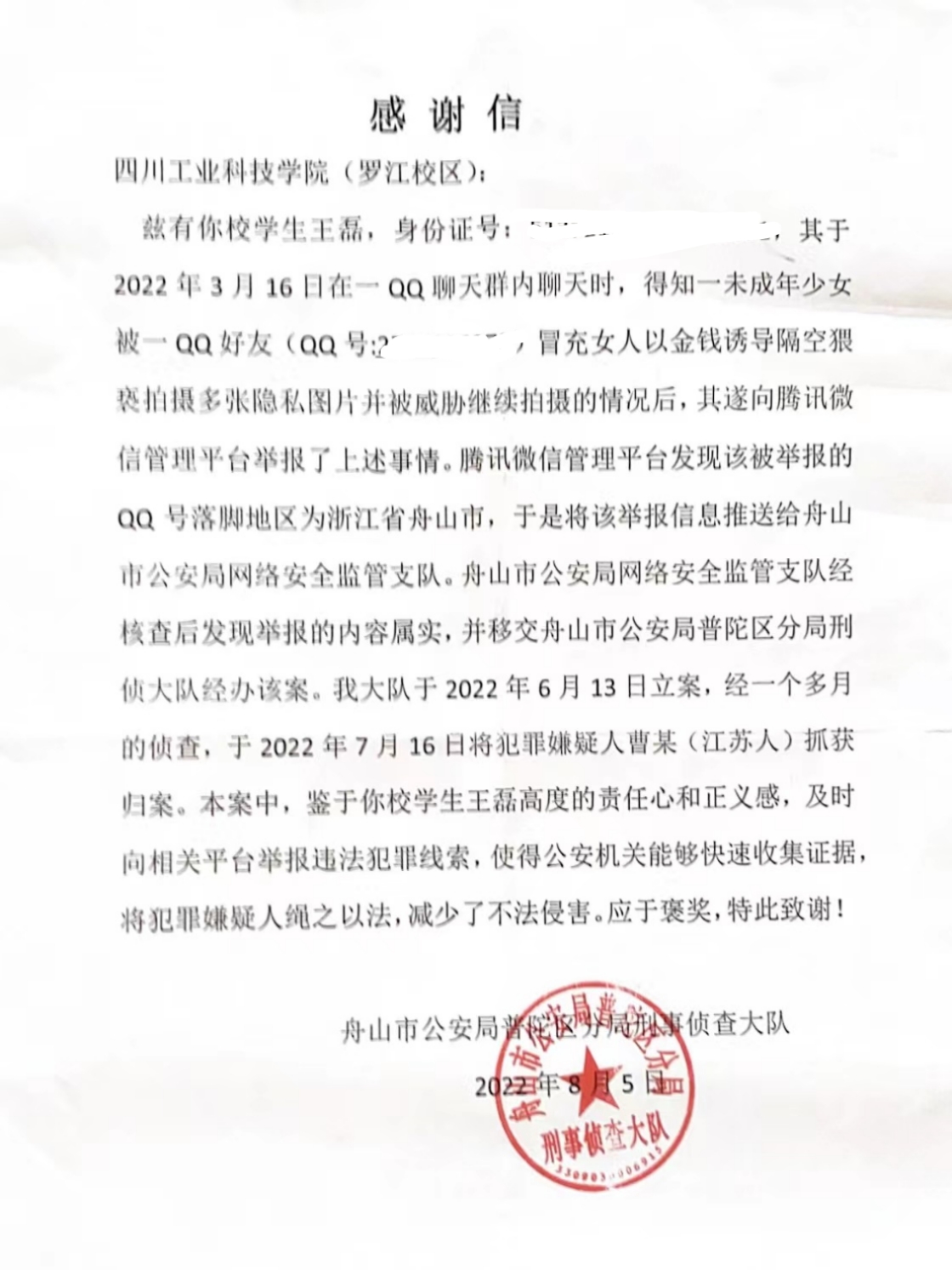 据悉,2022年3月16日,我校学生王磊在网络上得知一未成年少女被QQ好友冒充女人以金钱诱导隔空猥亵拍摄多张隐私图片并被威胁继续拍摄的情况后,及时向相关管理平台举报了上述事件。该被举报QQ号落脚地区的舟山市公安局普陀区分局刑侦大队经办此案,王磊同学及时提供的线索使得公安机关快速收集证据并将犯罪嫌疑人绳之以法。普陀区分局刑侦大队对此特意向我校王磊同学的安全意识和正义感提出褒奖和感谢。