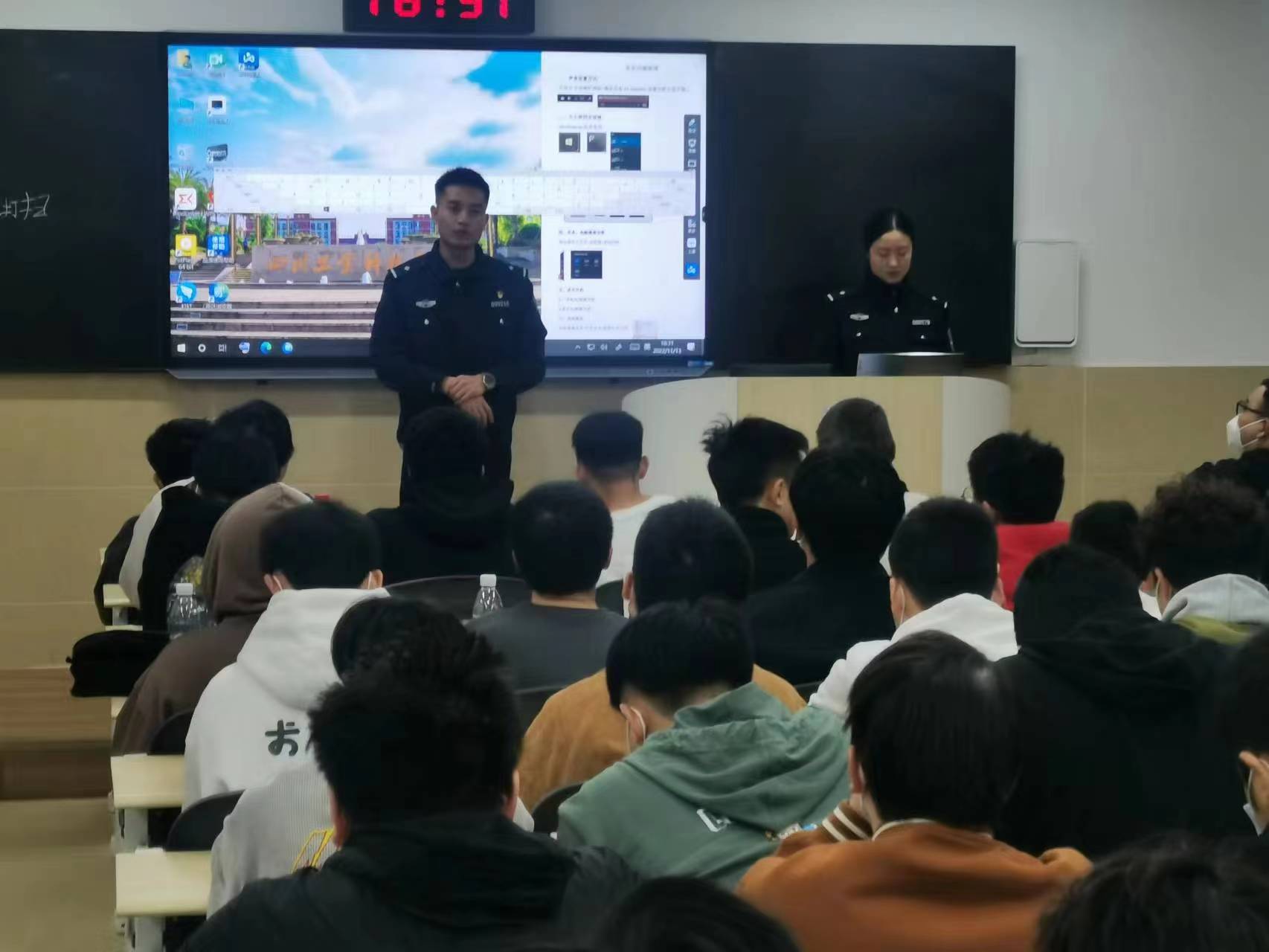 同时,针对近期电信诈骗活动频繁的态势,民警讲解了“兼职刷单、校园贷、网络游戏诈骗”等当前校园高发的九类电信网络诈骗手法。通过讲解生动的案例及宣传防范诈骗小技巧,让同学们了解掌握诈骗分子常用手段、辨别各种诈骗花样,并提醒同学们一定要提高自身防范诈骗意识,避免不必要的经济损失,遇事要及时向公安机关求助咨询。