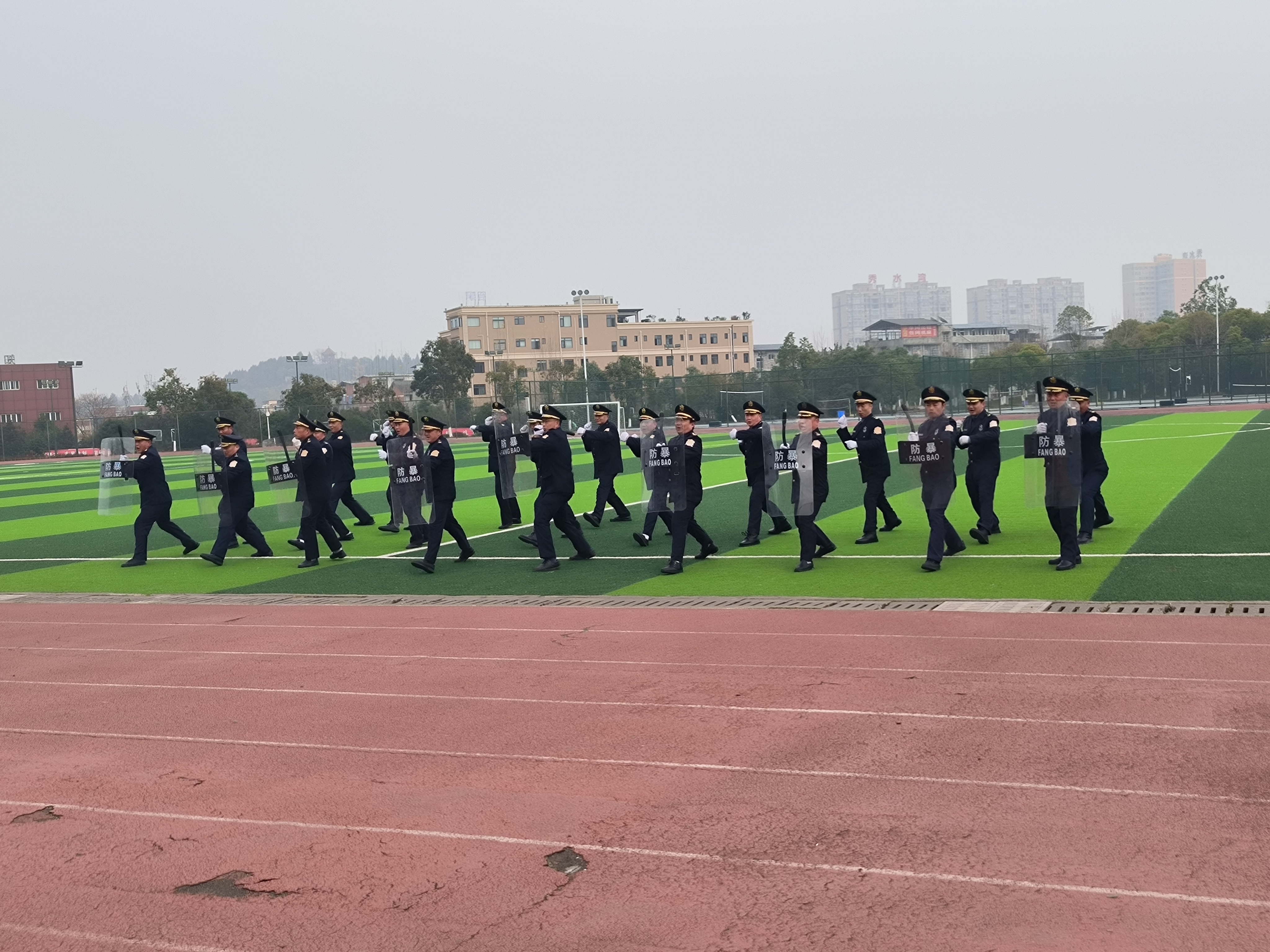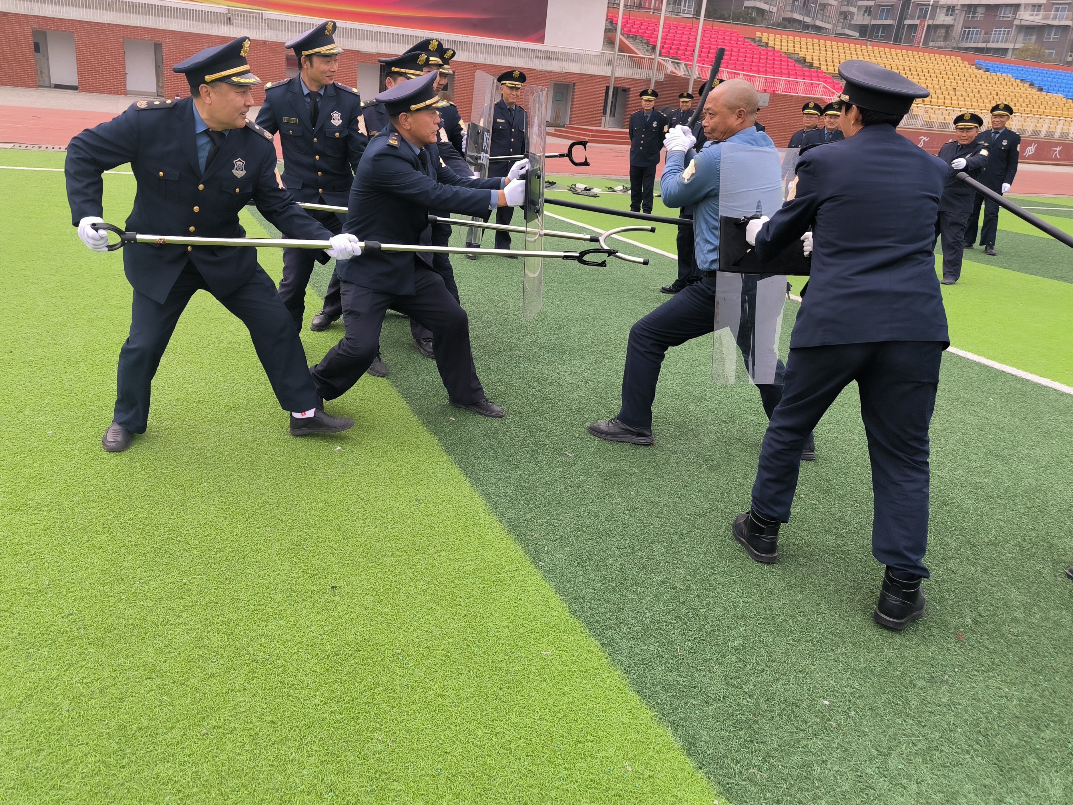 二是安保技能培训,向安保人员详细讲解示范盾牌、钢叉、警棍等常规安保器械的功能及使用方法,重点培训徒手控制、战术配合、应急防暴处置等内容,并指导安保人员正确掌握和使用各类防护器械。