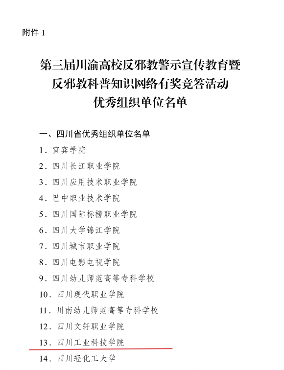 近日,学校在第三届川渝高校反邪教警示宣传教育暨反邪教科普知识网络有奖竞答活动中荣获“四川省优秀组织单位”荣誉称号。