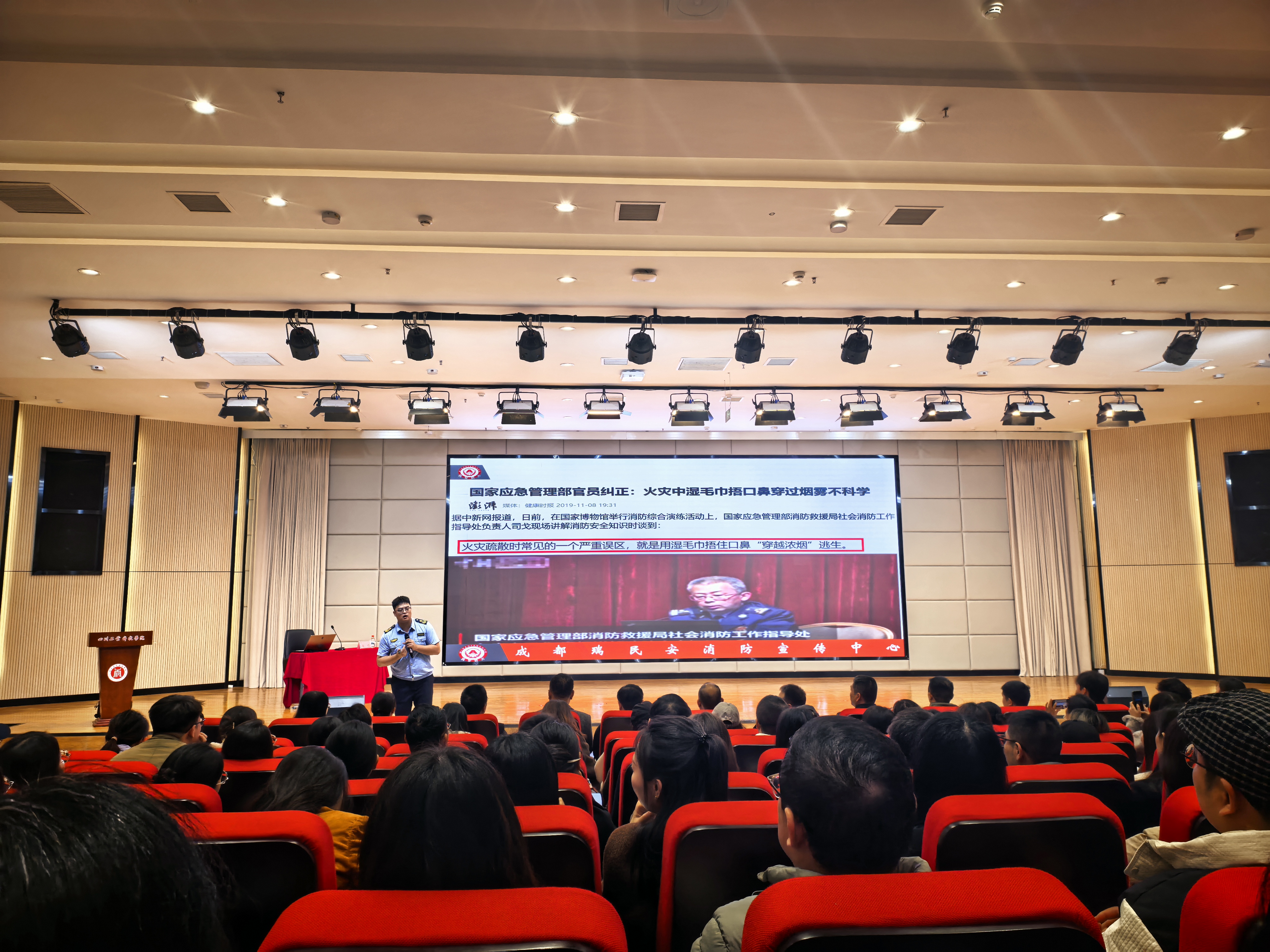 为深入贯彻落实国家“119”消防宣传月精神,进一步增强教师与学生的消防安全意识与自救互救能力,11月7日,由学校联合成都瑞民安消防宣传中心举办的“全民消防,生命至上——安全用火用电”主题培训,在龑江C区报告厅举行。增强消防知识、掌握基本应急技能。