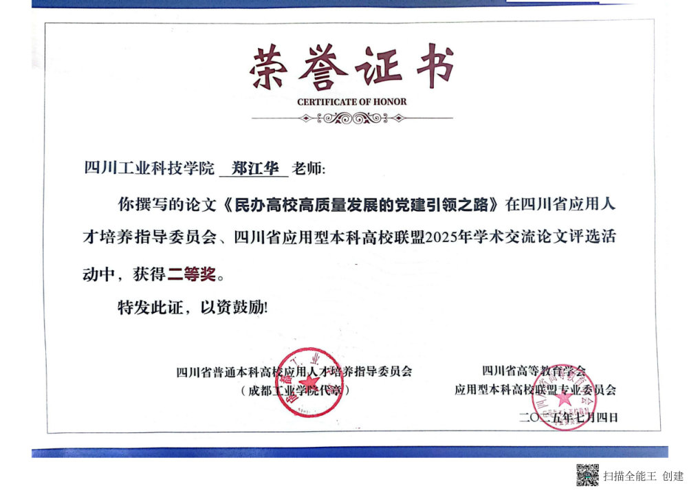 学校马克思主义学院郑江华老师撰写的《民办高校高质量发展中的党建引领之路》一文,在四川省应用人才培养指导委员会、四川省应用型本科高校联盟2025年学术交流论文评选活动中荣获二等奖。