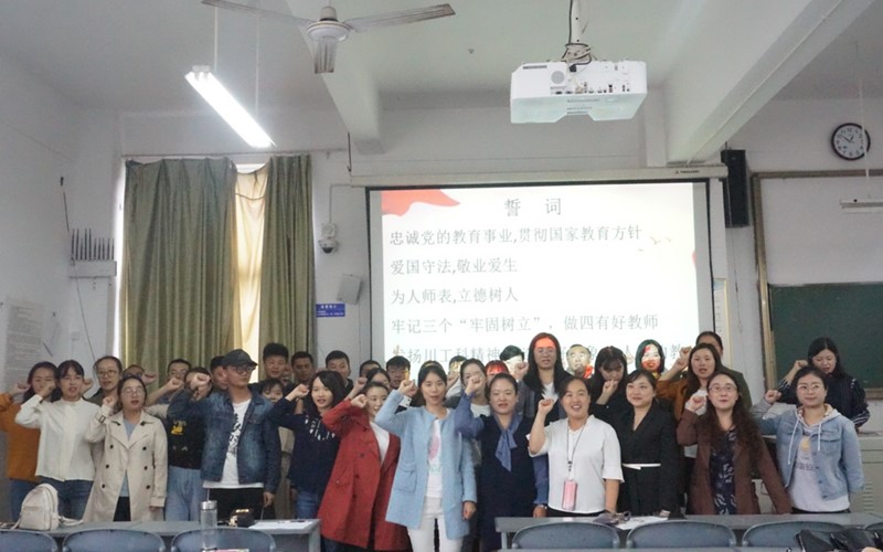 13点00分宣誓仪式正式在毓秀101开始,教师代表们全体肃立,右手举拳,庄严宣誓,郑重承诺:“忠诚党的教育事业,贯彻国家教育方针;爱国守法,敬业爱生;为人师表,立德树人;牢记三个‘牢固树立’,做四有好老师;发扬川工科精神,塑造良好形象;为人民的教育事业永远奋斗”。