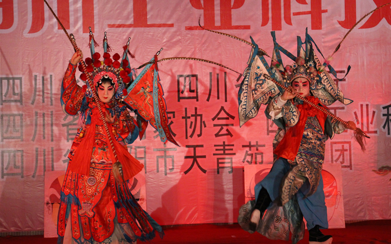 接下来表演的传统喜剧《拜新年》、川剧经典表演《人间好》以及综艺《梨园神韵》等曲目上均体现出了川剧的魅力非凡,其幽默风趣的语言表达平易近人,充满鲜明的地方色彩。这些曲目流淌着浓郁的生活气息且具有广泛的群众基础,在戏剧文化之上有着不同于京剧等的表现形式,尤其以'变脸'、'喷火'、'水袖'独树一帜,展现出与众不同的戏剧文化。