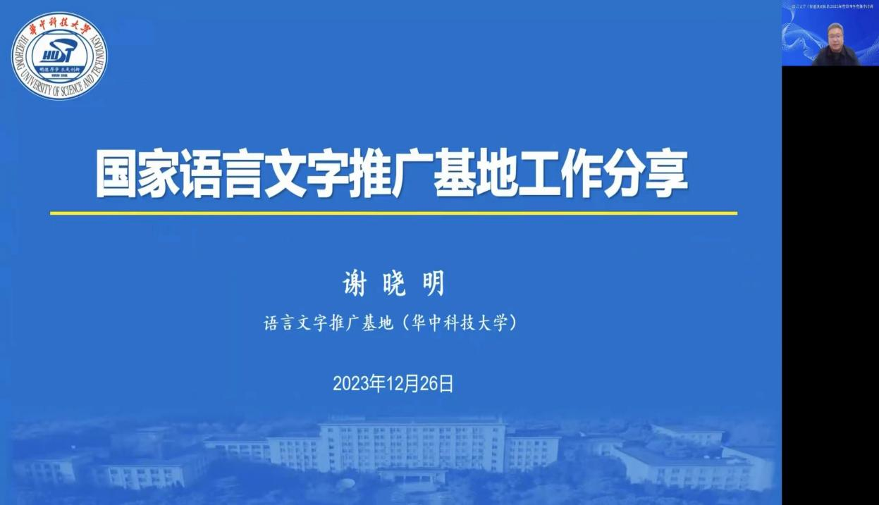 会议期间,谢晓明教授代表华中科技大学国家语言文字推广基地进行了本年度的工作分享。向参会人员简要介绍了基地工作机制,特别对宣传管理和宣发矩阵进行了工作分享,强调要联合校内外宣传资源进行工作。同时也向参会人员分享了事前活动预告、事中活动跟踪、以及事后效果评估的宣传新形式。最后简单的分享了本年度基地的特色工作内容。表示在下一年度将继续推进原创品牌语言文字推广工作。
