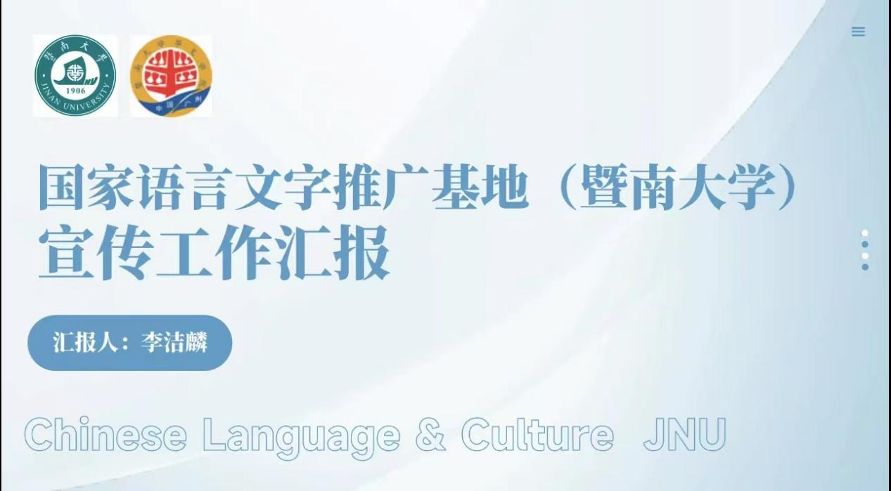随后,来自暨南大学国家语言文字推广基地的李洁麟主任进行了宣传工作汇报。汇报中,她首先对基地建设概况进行了介绍,再从两个面向,三个平台和四个阵地的内涵随建设对宣传工作进行了分享总结。同时也对基地的特色品牌建设做了分享。最后展望未来工作,表示将脚踏实地继续推进语言文字推广中心的发展建设。