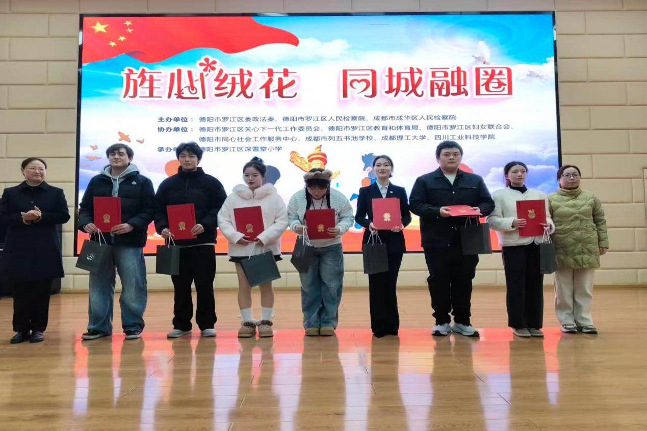 12月22日,学校志愿者团队在语委办主任刘琴老师的带领下,赴德阳市深雪堂小学,参与了由德阳市罗江区委政法委、罗江区人民检察院及成都市成华区人民检察院联合主办的“旌心绒花 同城融圈”法治宣传活动。活动创新采用沉浸式情景剧形式,为当地未成年人带来了一堂生动深刻的法治教育课。