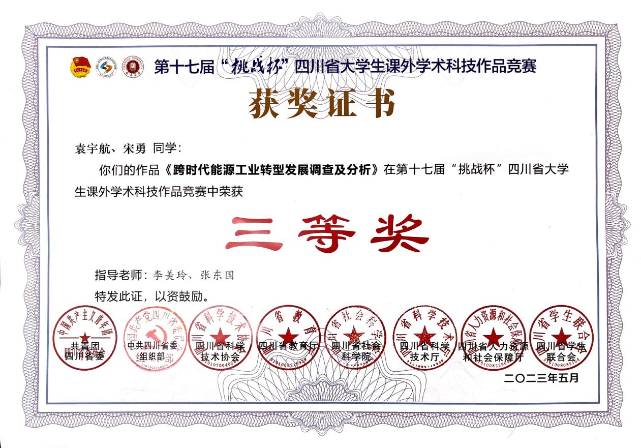 近日,我院学生袁宇航、宋勇作品《跨时代能源工业转型发展调查及分析》和刘茜村、宋欣悦作品《茶产业+模式——以四川雅安名山区为例基于茶旅融合模式下促进乡村振新与产业转型的调查分析》在第十七届“挑战杯”四川省大学生课外学术科技作品竞赛中获三等奖。
