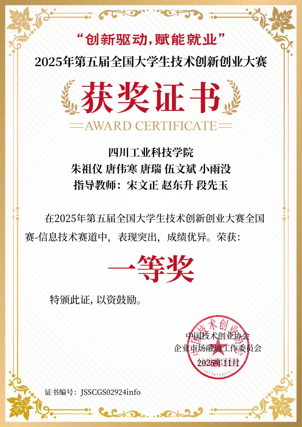 在2025年第五届全国大学生技术创新创业大赛中,学院学生团队在信息技术赛道荣获全国一等奖。