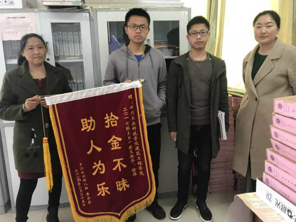24日上午,建筑工程学院2017级土木工程1班文旭华、徐伟两位同学在芒江村游玩时捡到了一部手机,两人在原地等待多时也不见有人来寻,后来在当地人的帮助下,通过多方打听,在当天下午找到了失主。第二日,失主黄女士来到学校将一面锦旗交到了学院老师手中,在老师一头雾水时,黄女士讲诉了事情的原委,老师们这才知道,咱们建筑工程学院出了这样两位拾金不昧的学生。