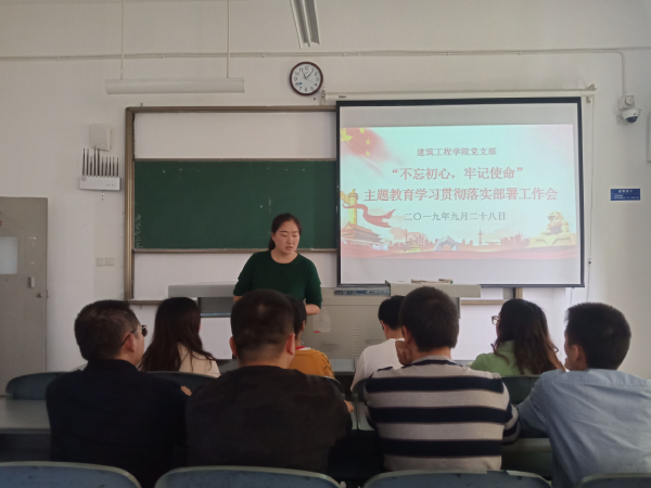 9月28日下午,建筑工程学院在学校钟灵楼403室召开“不忘初心、牢记使命”主题教育学习贯彻落实部署工作会。学院党支部副书记杨春作动员讲话并主持会议,全体教师党员、学生党员和入党积极分子参加了会议。