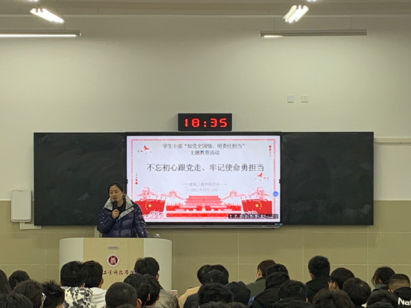 12月10日,建筑工程学院组织全院学生干部在学校龑江学村C-212开展了“知党史国情、明责任担当”主题教育活动。学院党总支副书记杨春主持活动并讲话。