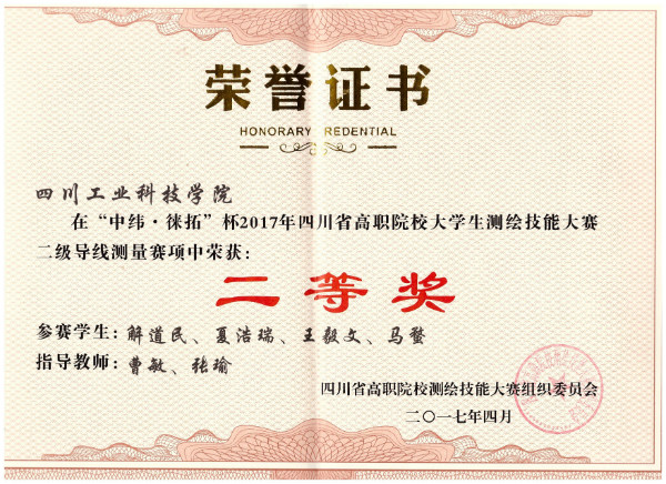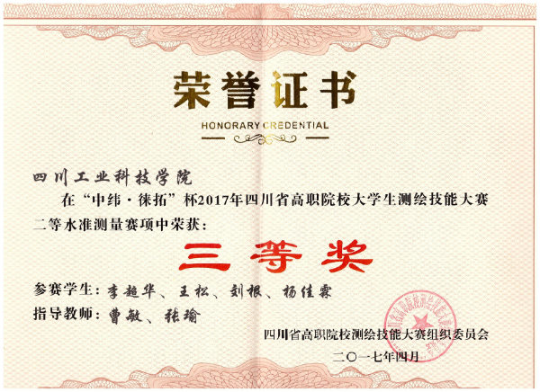 本次测绘技能大赛,学院师生克服了训练时间短,训练强度大的重重困难最终,2015级工程监理专业学生解道明、夏浩瑞、王毅文、马蝥荣获竞赛项目“二级导线测量”二等奖2015级工程监理专业学生李超华、王松、刘根、杨佳霖荣获竞赛项目“二等水准测量”三等奖。