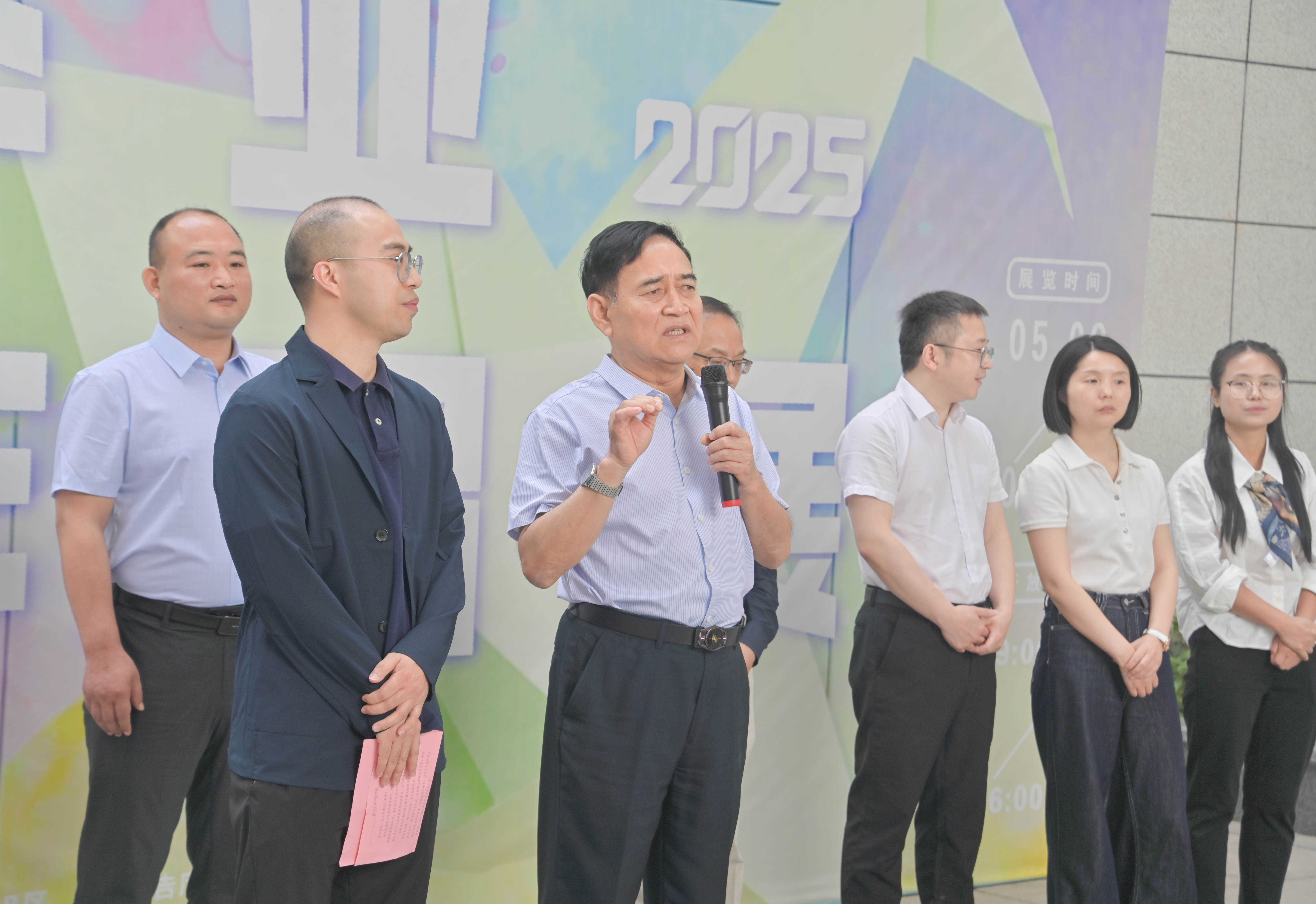 建筑工程学院院长宋文正在发言中强调,本届毕业展作品实现了传统技艺与现代科技的创新融合,展现了艺术设计教育的深层价值。他指出,诸多作品在设计实践中,实现了传统技艺的活态传承和文化基因的当代演绎。他勉励全体毕业生们在未来的艺术道路上继续绽放光彩。