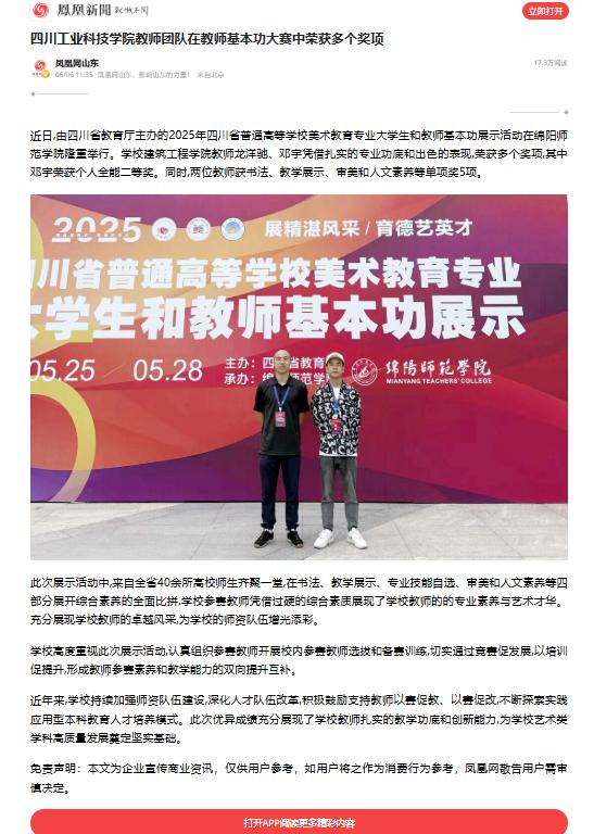 5月25日至28日,由四川省教育厅主办的2025年四川省普通高等学校美术教育专业大学生和教师基本功展示活动在绵阳师范学院举行。学校建筑工程学院教师龙洋驰、邓宇在比赛中表现优异,其中邓宇荣获个人全能二等奖,两位教师共获得书法、教学展示、审美和人文素养等5个单项奖。