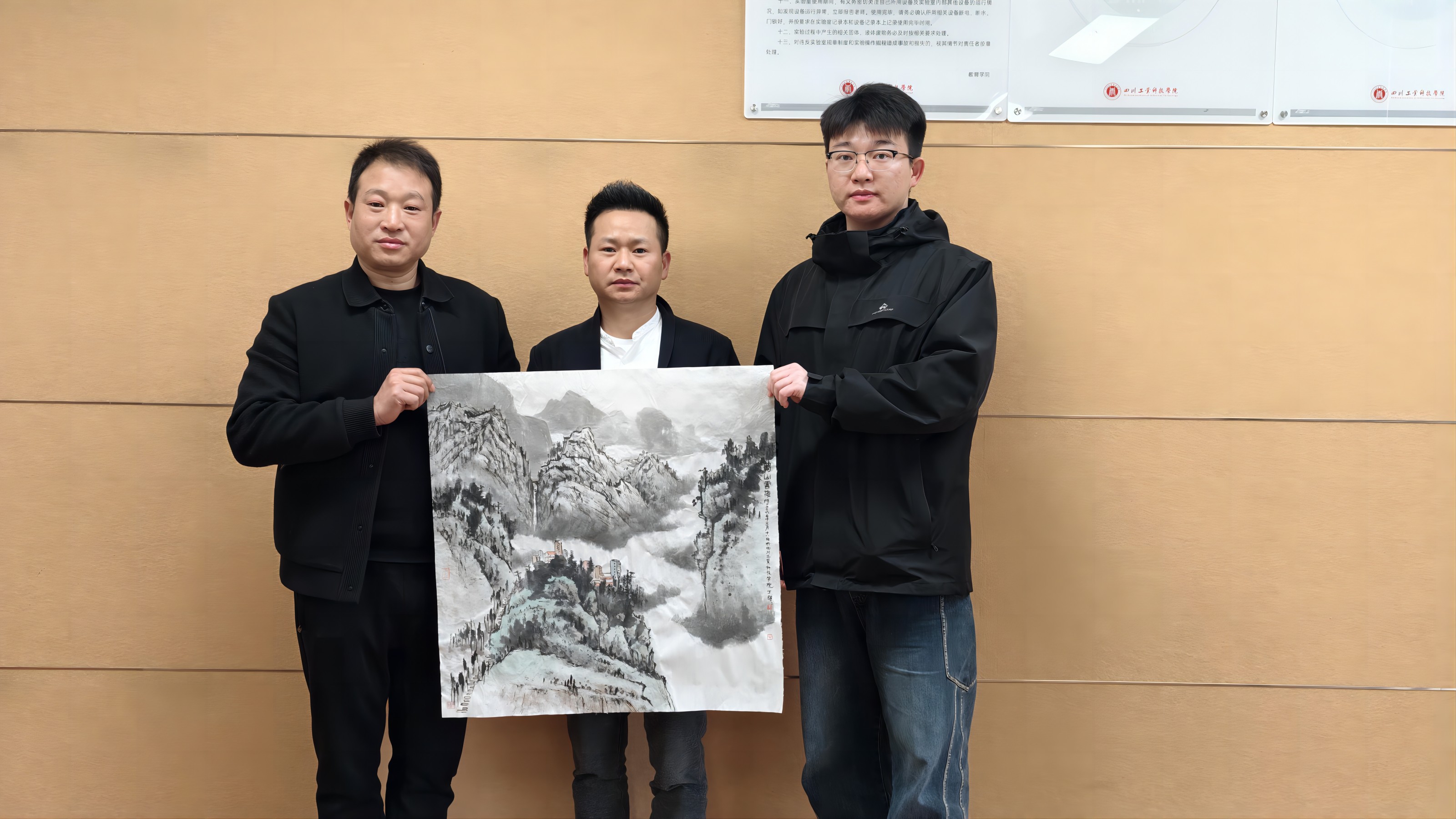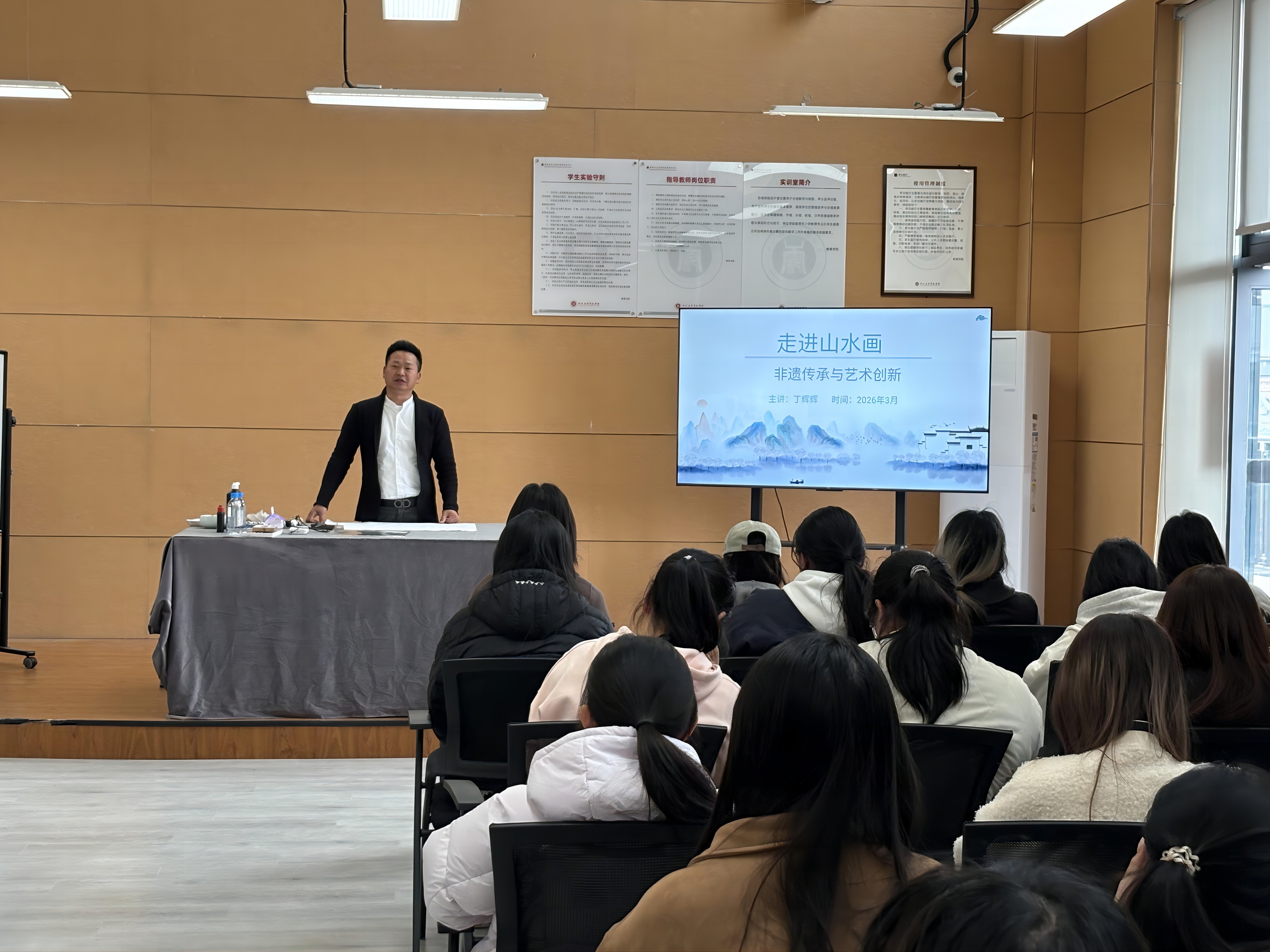 在实践活动中心,丁辉辉与师生进行面对面交流活动。他以“走进山水画”为题,结合自身创作经历,分享了传统书画艺术在当代的创新表达。在随后的现场作画环节,丁辉辉挥毫泼墨,即兴创作多幅水墨作品,其精湛的技法与独特的艺术视角赢得师生阵阵赞叹。学生们纷纷围聚观摩,就构图技法、创作灵感等问题踊跃提问,丁辉辉一一耐心解答,并指导学生进行现场练习。活动最后,丁辉辉将即兴创作的作品赠予学院。