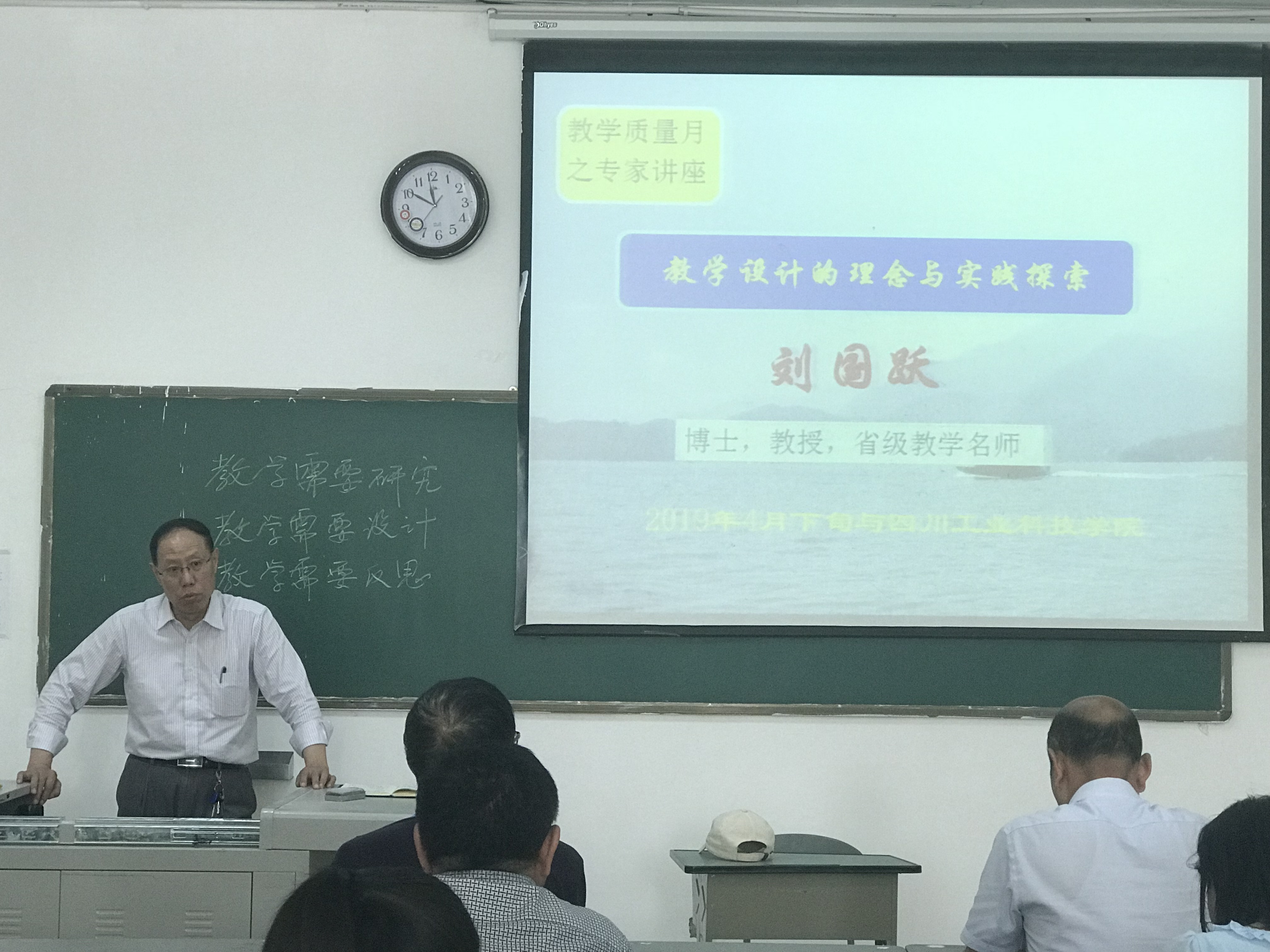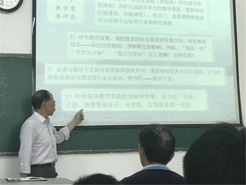 会上,刘国跃教授首先从课程教学设计理念方面阐述了教学研究的意义,他强调,备课与教学不是将内容简单串联和罗列,需要利用诸多方式与素材,应当依据教育理论与理念进行教学设计。接着,为大家介绍了斯腾豪斯的成功智力理论对学生发展的意义,他指出每个学生都具有成功智力的潜能,我们要以科学途径培养学生的综合智力,关注创造和实践能力。其次,演示了从研究教学大纲到课程教学的基本过程,展示了多种教学模式,希望老师们能根据具体教学实际采用恰当的教学方式。