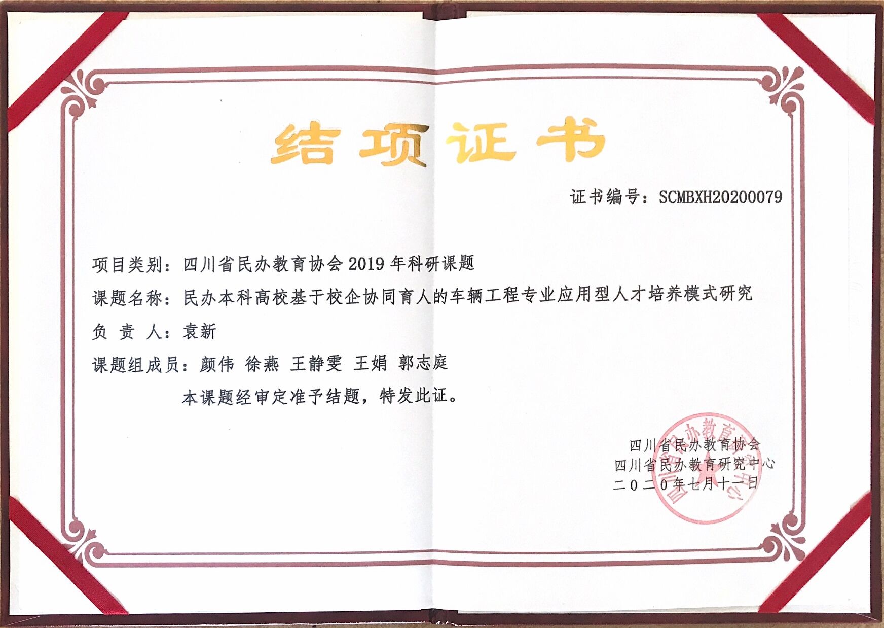 近日,由我院教师袁新研究的四川省民办教育协会2019年科研课题《民办本科高校基于校企协同育人的车辆工程专业应用型人才培养模式研究》(课题编号MBXH19YB093)经过一年多的辛苦工作,在经专家组鉴定,成功结题。