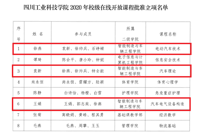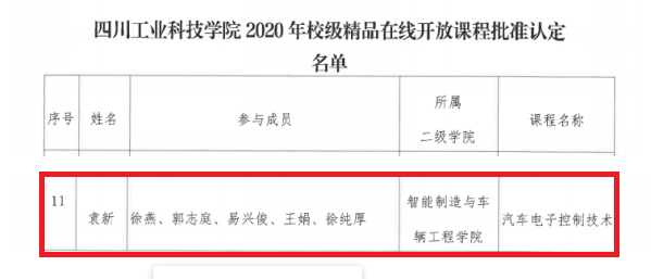 近日,学校公布了《关于2020年校级精品在线开放课程认定的通知》(川工科2020【147】)、《关于2020年校级在线开放课程立项的通知》(川工科2020【146】),我院袁新老师主持的课程《汽车电子控制技术》被认定为校级精品在线开放课程,徐燕老师主持的课程《电动汽车技术》、袁新老师主持的课程《汽车理论》、王娟老师主持的课程《汽车电气设备构造》3门课程获校级在线开放课程立项,加之黄春梅老师主持的课程《汽车服务工程》获校级“课程思政”立项,今年我院所推荐的5门课程全部获学校课程建设立项。
