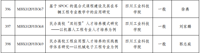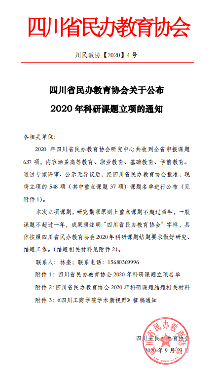 2020年9月23日,四川省民办教育协会公布了《2020 年科研课题立项的通知》(川民教协【2020】4 号)。我院教师徐燕、刘家麟、郭志庭三位教师申报的课题喜获立项。