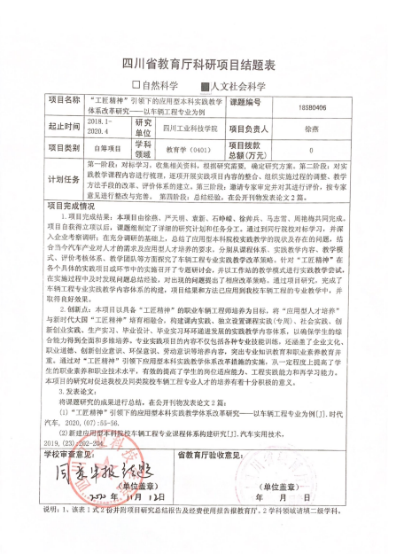 科研课题《“工匠精神”引领下的应用型本科实践教学体系改革研究——以车辆工程专业为例