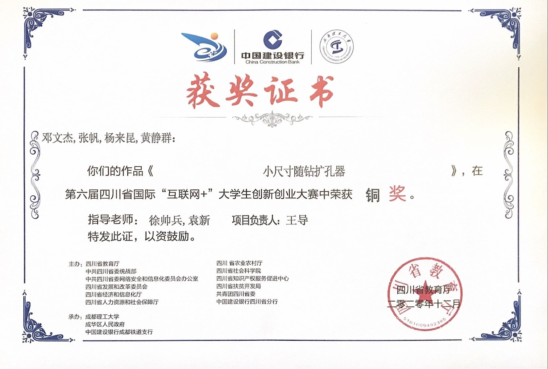 近日,四川省教育厅公布了“建行杯”第六届四川省国际“互联网+”大学生创新创业大赛获奖名单(川教函【2020】639号)。智能制造与车辆工程学院学生王导负责的项目《小尺寸随钻扩孔器》(指导教师:徐帅兵、袁新)获得铜奖。这是我院学生连续三年获得该项赛事铜奖。