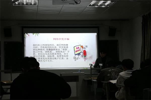 本次班会介绍同学们有可能遇到的骗局以及应采取的对应防骗手段为主要内容,提高同学们的防骗意识,向同学们简述了网络购物诈骗、网络中奖诈骗、冒充身份的网络诈骗、网络游戏装备及游戏币交易、Q币交易进行诈骗以及网络兼职诈骗。给同学们强调在各种场合我们都应提高警惕,不要有“贪婪之心”,克服“恐惧之心”,放弃“好奇之心”,警惕“麻痹之心”,遇到陌生短信电话、中奖信息、QQ求助、汇款等事情一定小心谨慎,仔细甄别,千万不要轻信麻痹和上当受骗。