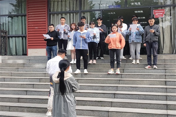 4月25日,智能学院参加诗歌朗诵比赛的师生在汽修102教室前进行有序排练,指导老师就朗诵的语调、声音的高低以及朗诵时的感情进行指导分析。