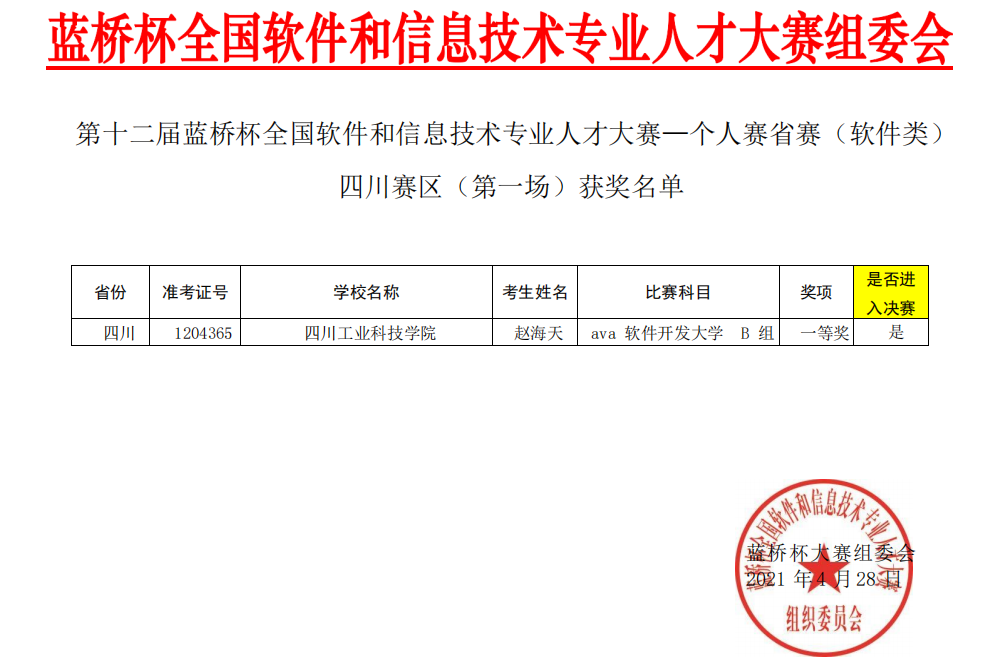 日前,第十二届蓝桥杯全国软件和信息技术专业人才大赛省赛结果揭晓,我院学生在比赛中喜获佳绩,分别获“单片机设计与开发项目”一等奖1个,二等奖3个;获“Java软件开发项目”一等奖1个。其中张华军同学和赵海天同学将代表四川赛区晋级国赛。