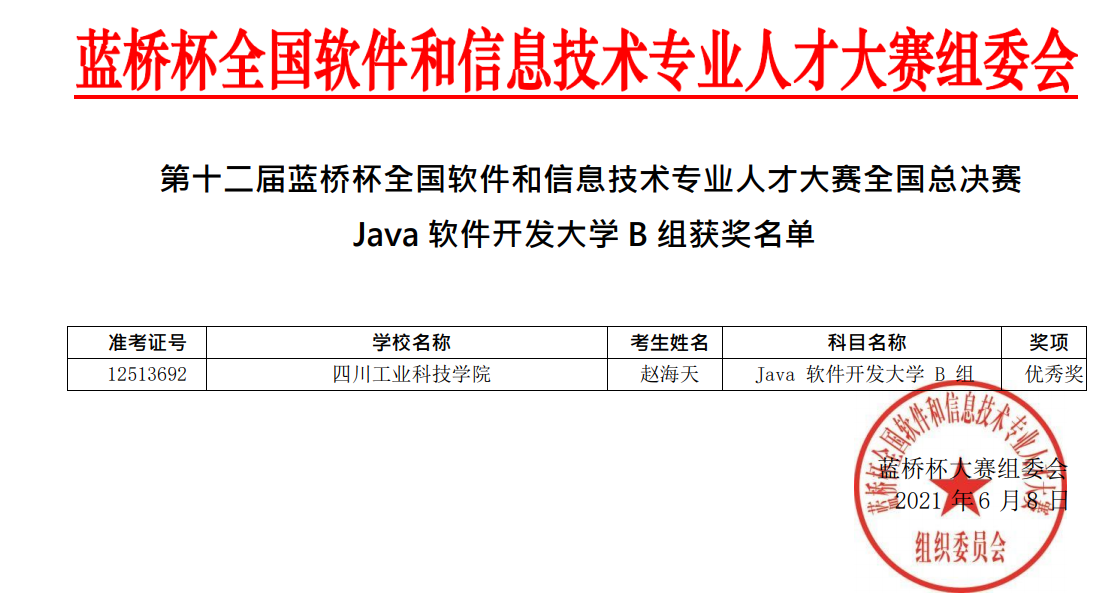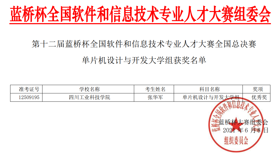 日前,第十二届蓝桥杯全国软件和信息技术专业人才大赛国赛结果揭晓,我院学生在比赛中喜获佳绩,18级机械电子工程3班的张华军同学获“单片机设计与开发项目”优秀奖1个;19级机器人1班赵海天同学获“Java软件开发项目”优秀奖1个。